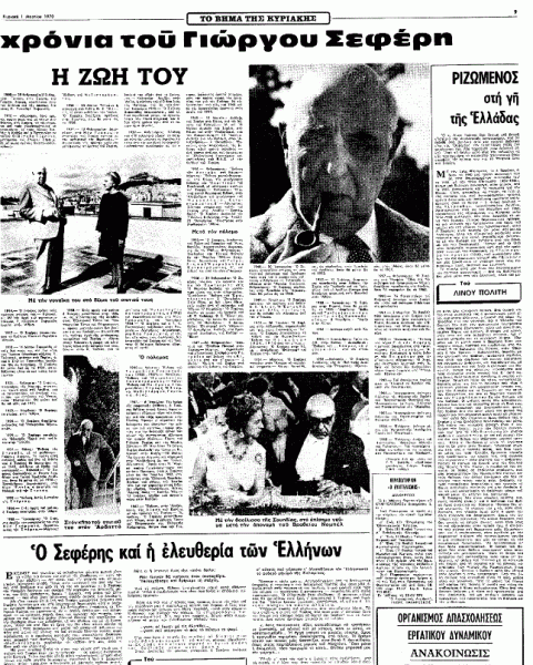 *Κείμενο του Λίνου Πολίτη, που έφερε τον τίτλο «Ριζωμένος στη γη της Ελλάδας» και είχε δημοσιευτεί στην εφημερίδα «Το Βήμα» την Κυριακή 1η Μαρτίου 1970, στο πλαίσιο αφιερώματος της εφημερίδας στα εβδομήντα χρόνια του Γιώργου Σεφέρη.