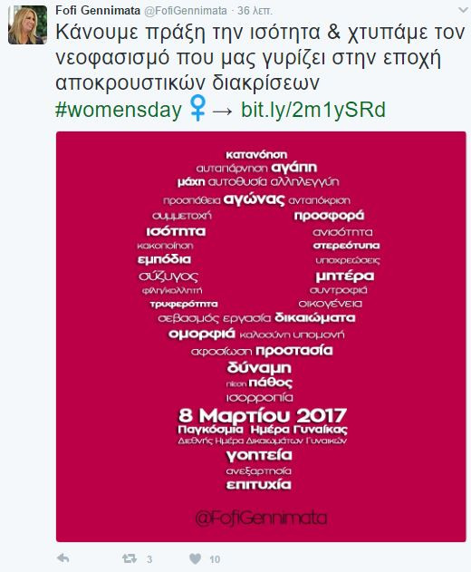«Kάνουμε πράξη την ισότητα και χτυπάμε τον νεοφασισμό που μας γυρίζει στην εποχή αποκρουστικών διακρίσεων» ήταν το μήνυμα που έστειλε η Φώφη Γεννηματά από το twitter για την Παγκόσμια Ημέρα της Γυναίκας.