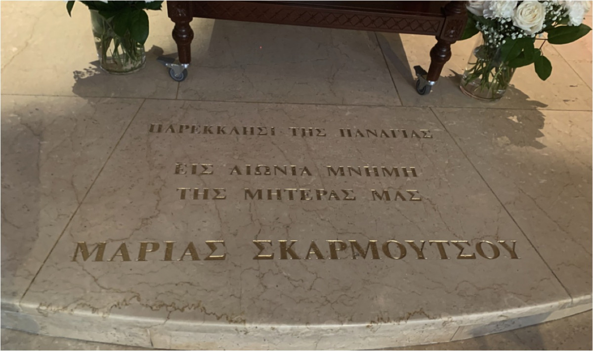 Με την δωρεά μας στην μνήμη της, τιμούμε σήμερα την μητέρα μας, ηρωίδα της μετανάστευσης και της ζωής μας από το 1975. Τιμούμε την θαρραλέα και ακούραστη μητέρα μας για τις δεκάδες εργασίες που έκανε σ’ αυτή τη χώρα για να επιζήσουμε και να ανέβουμε. Η μητέρα μας, εργάτρια ζαχαροπλαστείου αρχίζοντας την μέρα μετά την άφιξή μας στην Αμερική, 1η Μαρτίου 1975, κάτω του χαμηλότερου μισθού. Η μητέρα μας πουλώντας λουλούδια έξω από τις αίθουσες δεξιώσεων του Crystal Palace στην Αστόρια. Η μητέρα μας γαζώτρια σε ραπτομηχανές εργοστασίων για δεκαετίες, πατώντας το πεντάλ της μηχανής όλη μέρα με τα χέρια της να πετούν φωτιές. Η μητέρα μας καθαρίστρια. Η μητέρα μας βοηθός ηλικιωμένων. Η μητέρα μας ατρόμητη, ακούραστη, με δύναμη και αισιοδοξία που αντλούσε από τις προσευχές της στην Παναγία, φάρος και λιμάνι σωτηρίας γι αυτή. Τιμούμε σήμερα και πάντα την μνήμη της μητέρας μας, Μαρίας Σκαρμούτσου.