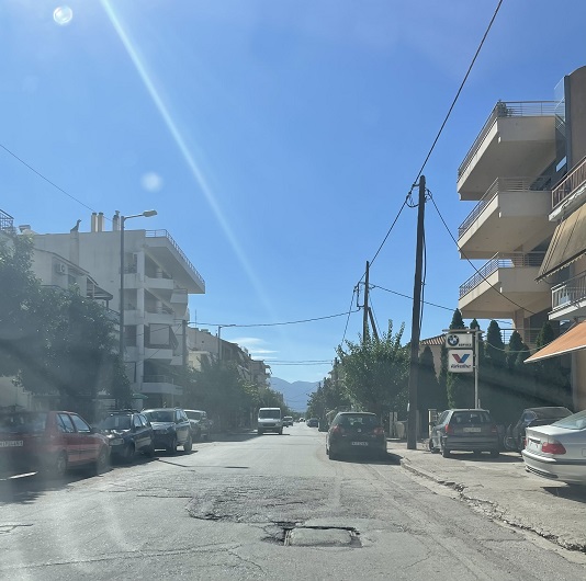 Υπάρχουν σημαντικές φθορές και λακκούβες στο οδόστρωμα ενώ τα σταθμευμένα αυτοκίνητα και στις δυο πλευρές του δρόμου δυσκολεύουν την ομαλή ροή της κυκλοφορίας.