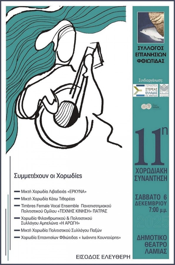 Το Σάββατο (6/12) θα πραγματοποιηθεί στο Δημοτικό Θέατρο Λαμίας, η 11η Χορωδιακή Συνάντηση του Συλλόγου Επτανησίων Φθιώτιδας.