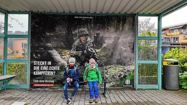 Η φωτογραφία στη πόλη Überlingen στη Βάδη - Βιτεμβέργη, απεικονίζει δύο μαθητές που περιμένουν στη στάση Λεωφορείου, με την αφίσα που προβάλλει την ένταξη στο γερμανικό στρατό πίσω τους να γραφεί : «υπάρχει μέσα σου μια αληθινή μαχήτρια?» Βρές το επάγγελμά σου. (Φωτογραφία: Judith Feeser, από την εφημερίδα Suedkurier).