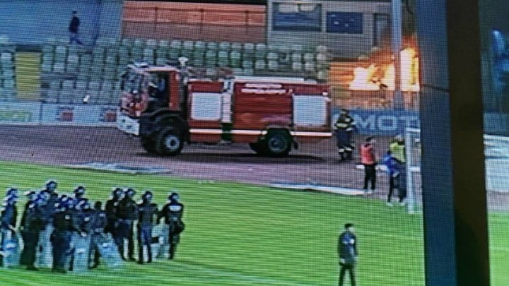Με το που έγινε γνωστή η αναβολή του αγώνα (σ.σ. για την τύχη του θ΄ αποφασίσει ο αθλητικός δικαστής) έγιναν μικρής έκτασης επεισόδια έξω από το γήπεδο, με την αστυνομία ν΄ «απαντά» με δακρυγόνα. Επίσης άναψε φωτιά στην ανατολική κερκίδα και χρειάστηκε η παρέμβαση της πυροσβεστικής για την κατάσβεσή της.