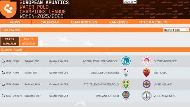 Τα σημαντικότερα παιχνίδια της φετινής ευρωπαϊκής πορείας τους δίνουν το διήμερο 10-11 Απριλίου οι γυναικείες ομάδες υδατοσφαίρισης της Βουλιαγμένης και του Ολυμπιακού. Αμφότερες δοκιμάζονται επί ισπανικού εδάφους, αντιμετωπίζοντας στους πρώτους προημιτελικούς του Champions League τις δύο περσινές φιναλίστ της διοργάνωσης: ο ΝΟΒ τίθεται αντιμέτωπος με την κάτοχο του τίτλου Σαντ Αντρέου, το βράδυ της Μεγάλης Παρασκευής (10/4, 21:30) στη Βαρκελώνη, ενώ οι «ερυθρόλευκες» παίζουν στο... άντρο της επτά φορές πρωταθλήτριας Ευρώπης Σαμπαντέλ, το μεσημέρι του Μεγάλου Σαββάτου (11/3, 13:00). Στόχος των δύο κορυφαίων ελληνικών ομάδων, να φύγουν από την Καταλονία με ένα αποτέλεσμα που θα τους δίνει πλεονέκτημα -ή τουλάχιστον θα αφήνει ανοιχτή την υπόθεση πρόκριση στο final-4, ενόψει των αγώνων ρεβάνς, που θα γίνουν στις 16 Μαϊου.