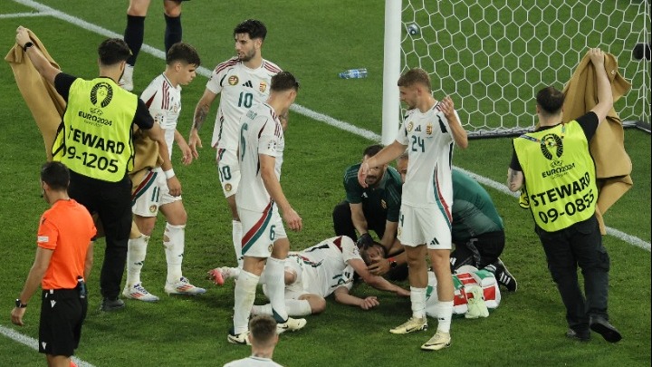 Ο Ούγγρος διεθνής φάνηκε να έχει πέσει αναίσθητος στον αγωνιστικό χώρο, με τους συμπαίκτες του να σχηματίζουν κύκλο γύρω του ξετυλίγοντας ένα καφέ σεντόνι.