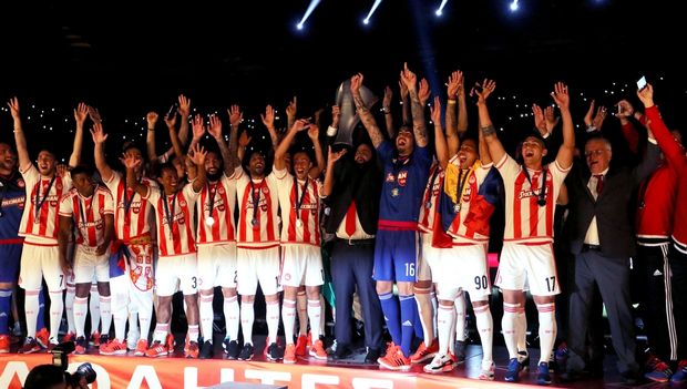 Ο Τσόρι Ντομίνγκες ήταν ο πρώτος παίκτης που παρέλαβε από τον Βαγγέλη Μαρινάκη το κύπελλο του πρωταθλητής Ελλάδας, στην φιέστα που διοργάνωσε η ΠΑΕ Ολυμπιακός, για την κατάκτηση του 43ου πρωταθλήματος των «ερυθρολεύκων», μετά το 5-0 επί της Καλλονής. Νωρίτερα στις οθόνες του «Γεώργιος Καραϊσκάκης» έπαιζαν βίντεο με αποσπάσματα από τις σημαντικές επιτυχίες του Ολυμπιακού στην Ευρώπη και στιγμιότυπα από τις εσωτερικές διοργανώσεις. Ειδική μνεία έγινε και στο κοινωνικό πρόσωπο των πρωταθλητών με τις δράσεις για την βοήθεια προς τους πρόσφυγες. Ακολούθως μπήκαν στον αγωνιστικό χώρο οι πιτσιρικάδες που στελεχώνουν τις μικρότερες ομάδες του Ολυμπιακού με τα 42 τρόπαια, καθώς και οι αθλητές και οι αθλήτριες από τα άλλα τμήματα που έφεραν διακρίσεις σε ομαδικά αθλήματα. Από την ομάδα που κατέκτησε τον τίτλο, πρώτος πάτησε το χορτάρι ο Μάρκο Σίλβα, ενώ ακολούθησαν το τεχνικό επιτελείο και οι ποδοσφαιριστές που οδήγησαν την ομάδα σε ακόμη έναν θρίαμβο. Οι χιλιάδες φίλοι των Πειραιωτών αποθέωσαν τους Ρομπέρτο και Φουστέρ «απαιτώντας» την παραμονή τους στο λιμάνι, ενώ υπό το άκουσμα του ύμνου της ομάδας, ο Ντομίνγκες σήκωσε το τρόπαιο στον φαληρικό ουρανό...