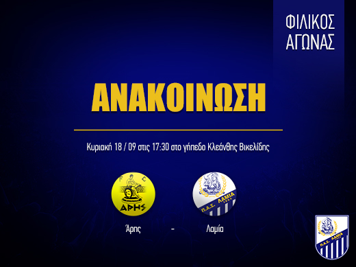 «Η ΠΑΕ ΠΑΣ ΛΑΜΙΑ ενημερώνει τους φιλάθλους ότι στις 18 Σεπτεμβρίου ημέρα Κυριακή και ώρα 17:30 θα διεξαχθεί φιλικός αγώνας με τον ΑΡΗ στο Γήπεδο Κλεάνθης Βικελίδης.