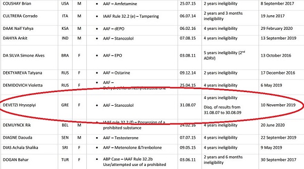 Μάλιστα, το όνομα της ελληνίδας πρώην τριπλουνίστριας βρίσκεται στη λίστα με τους τιμωρημένους αθλητές της IAAF, η οποίας αναφέρει ότι τιμωρείται με 4 χρόνια για χρήση απαγορευμένης ουσίας. Τυπικά η τιμωρία δεν έχει καμία σημασία αφού η Δεβετζή έχει σταματήσει να αγωνίζεται.