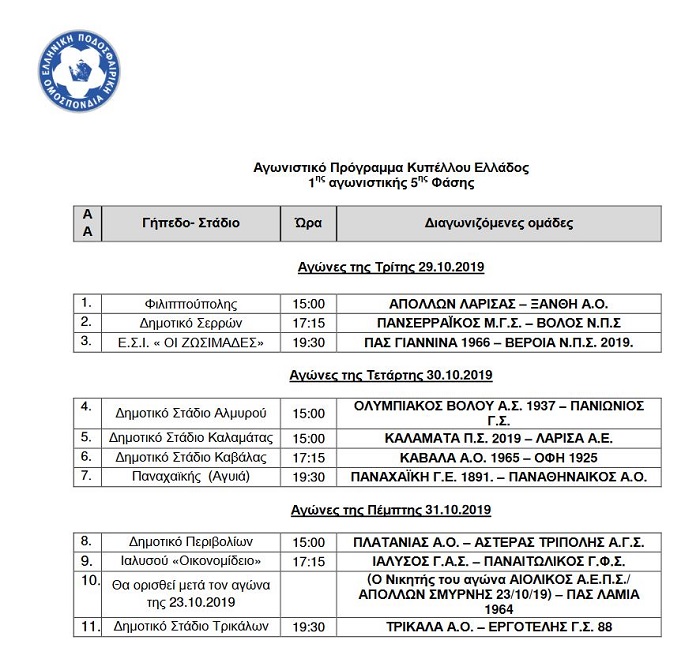 Δείτε το πλήρες πρόγραμμα της 5ης φάσης του Κυπέλλου Ελλάδος στην ακόλουθη φωτογραφία: