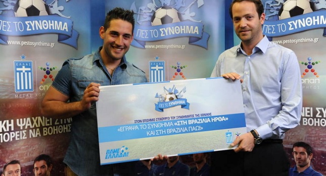 Η εμψύχωση της Εθνικής συνεχίζεται! Η ΟΠΑΠ σας καλεί να λάβετε μέρος στην κλήρωση που μοιράσει αναμνηστικά δώρα της Εθνικής μας ομάδας και θα στείλει ακόμα έναν τυχερό στη Βραζιλία. Μπείτε στο www.pestosynthima.gr από τον υπολογιστή, το tablet ή το smartphone σας, για να ακούσετε το «ΣΤΗ ΒΡΑΖΙΛΙΑ ΗΡΘΑ» να το τραγουδήσετε, να το κατεβάσετε στον υπολογιστή σας, να το μοιραστείτε με τους φίλους σας και να δυναμώσετε τη φωνή της Εθνικής στη Βραζιλία.
