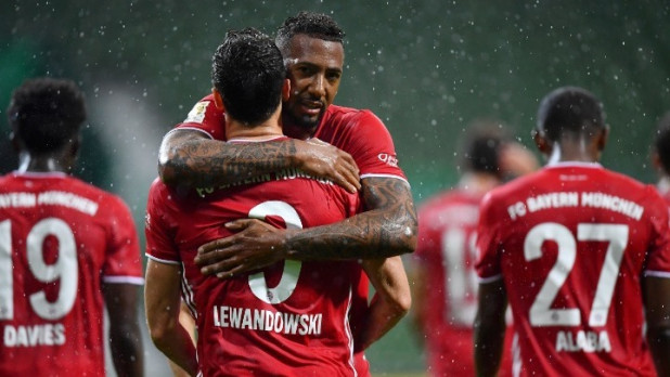 Η Μπάγερν Μονάχου έκανε αυτό που ξέρει να κάνει καλύτερα από τον καθένα στη Γερμανία: Επικράτησε με 1-0 (και) της Βέρντερ στη Βρέμη, με το γκολ του Ρόμπερτ Λεβαντόφσκι στο 43ο λεπτό, «άντεξε» στην πίεση όταν έμεινε με δέκα παίκτες στο 79' μετά την αποβολή του Ντέιβις (2η κίτρινη) και πανηγύρισε και μαθηματικά τον 8ο συνεχόμενο τίτλο της και 30ο συνολικά στην ιστορία της Bundesliga. Διότι ακόμη κι αν η Ντόρτμουντ κάνει το «3 στα 3» στα ματς που απομένουν, δεν μπορεί πλέον να καλύψει το +10 που έχουν στη βαθμολογία οι Βαυαροί (76β.-66β.). Τεράστια συνεισφορά στο διπλό-τίτλου της Μπάγερν είχε και ο Μάνουελ Νόιερ, με την απόκρουση για... high-lights στο 90', σε κοντινή κεφαλιά του Οζάκο.