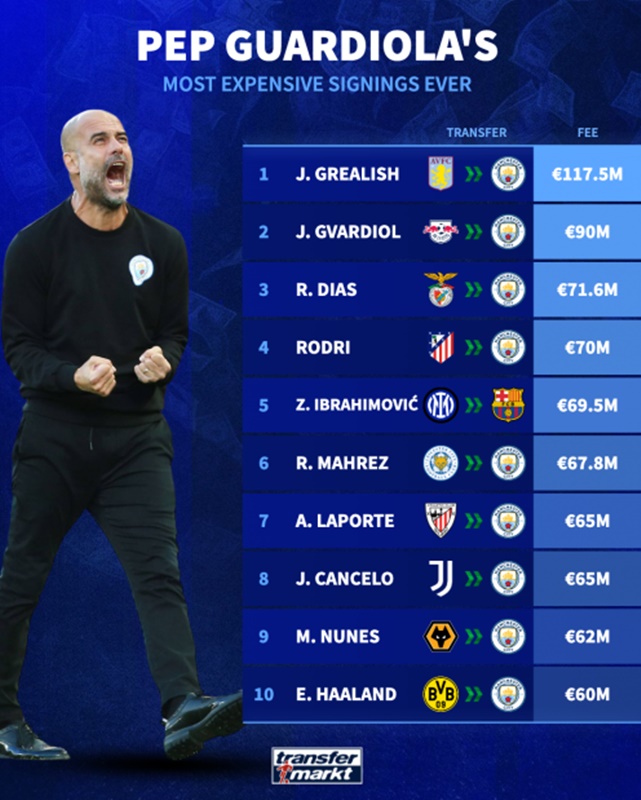 Καθ' όλη τη διάρκεια της...θητείας του σε Μπαρτσελόνα, Μπάγερν Μονάχου και Μάντσεστερ Σίτι, ο Καταλανός προπονητής έκανε μεταγραφές αξίας 2,06 δισ. ευρώ σε παίκτες.