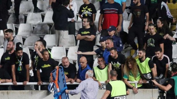 Ισόπαλο χωρίς τέρματα έληξε το χθεσινό ντέρμπι στο ΓΣΠ μεταξύ της Ομόνοιας και της ΑΕΚ, στο πλαίσιο της 9ης ημέρας της κυπριακής λίγκας. Το ματς είχε ένα σοβαρό ατύχημα, καθώς οπαδός της ΑΕΚ υπέστη βαριά κρανιογκεφαλική κάκωση όταν έπεσε από τη νότια κερκίδα στη καταπακτή του γηπέδου, κατά τη διάρκεια του πρώτου ημιχρόνου της αναμέτρησης. Ο άτυχος φίλαθλος νοσηλεύεται σε σοβαρή κατάσταση και σύμφωνα με κυπριακά ΜΜΕ θα υποβληθεί σε χειρουργική επέμβαση.