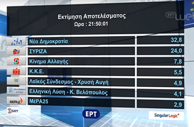 Σύμφωνα με το πρώτο «ασφαλές αποτέλεσμα», που ανακοίνωσε ο εκτελεστικός διευθυντής της εταιρείας, Γιάννης Θεοδωρόπουλος, η «Ελληνική Λύση» του Κυριάκου Βελόπουλου αναμένεται να εισέλθει στην Ευρωβουλή σε αντίθεση με τη «ΜέΡΑ 25» του Γιάννη Βαρουφάκη, η οποία πιθανόν να μην καταφέρει «για λίγο» να πιάσει το όριο εισόδου.