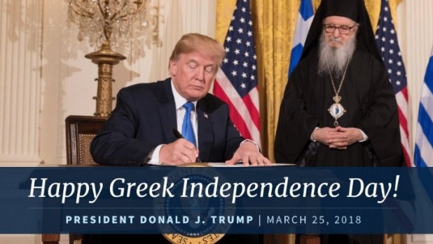 «Ο Πρόεδρος Ντόναλντ Τραμπ ανακηρύσσει την 25η Μαρτίου 2018 ως Ημέρα της Ελληνικής Ανεξαρτησίας: Εθνική Ημέρα του εορτασμού της Ελληνικής και Αμερικανικής Δημοκρατίας», αναφέρει σε ανάρτηση στον προσωπικό του λογαριασμό στο Twitter ο Πρόεδρος των ΗΠΑ.