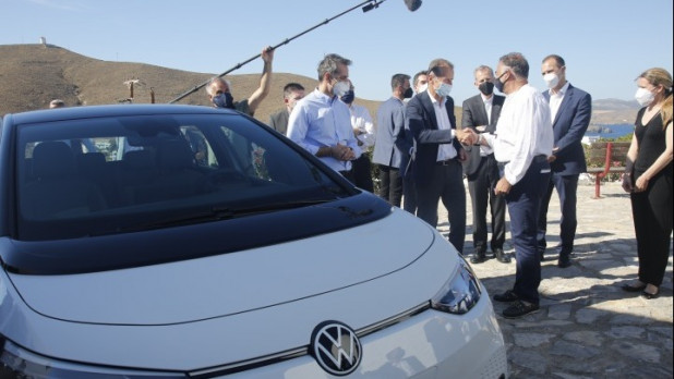 Εν συνεχεία, ο πρωθυπουργός παρακολούθησε την παράδοση 12 φορτιστών και οκτώ ηλεκτρικών αυτοκινήτων, δωρεά της Volkswagen, στην Αστυνομία, τη δύναμη του Λιμενικού και την Πολιτική Αεροπορία. Επίσης δωρήθηκε ένα ασθενοφόρο. Ο πρωθυπουργός και ο κ. Diess είχαν συζήτηση με κατοίκους για τα οφέλη από τα ηλεκτροκίνητα αυτοκίνητα για τους πολίτες και το περιβάλλον και ειδικά για την Αστυπάλαια που γίνεται ένα πρότυπο νησί «πράσινης» ανάπτυξης.