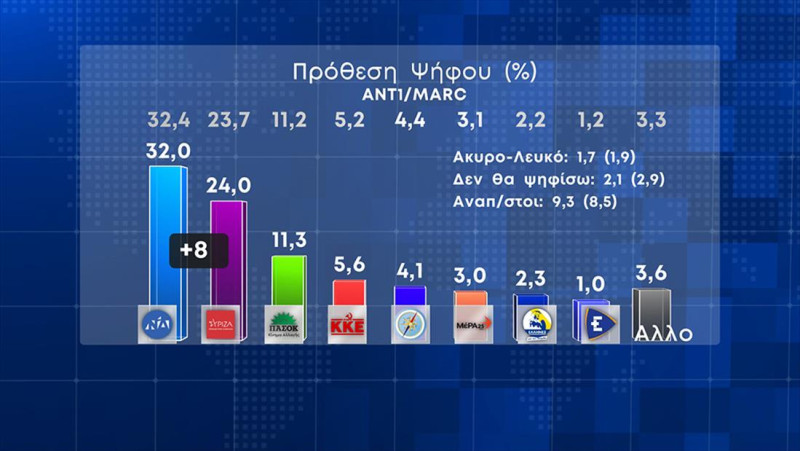 Στο 8% διαμορφώνεται η διαφορά της Νέας Δημοκρατίας με τον ΣΥΡΙΖΑ, σύμφωνα με την τελευταία δημοσκόπηση της εταιρείας Marc, η οποια διεξήχθη για λογαριασμό του ΑΝΤ1.