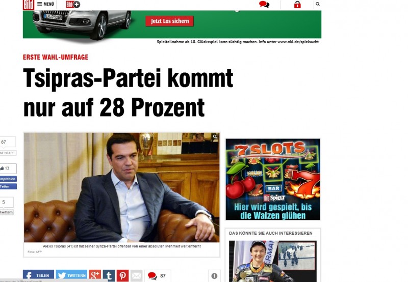 Δημοσκόπηση της Bild: ΣΥΡΙΖΑ 28%, ΝΔ 25% και Λαϊκή Ενότητα 8%