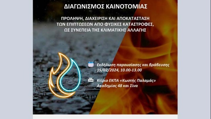 Εννέα καινοτόμες προτάσεις με τη χρήση σύγχρονων τεχνολογιών που συνδέονται με την πρόληψη, διαχείριση και αποκατάσταση των επιπτώσεων από τις φυσικές καταστροφές, συνέπεια της κλιματικής αλλαγής βρίσκονται στο επίκεντρο της αξιολόγησης της Επιτροπής που έχει συσταθεί από το Κέντρο Καινοτομίας και Επιχειρηματικότητας «Αρχιμήδης» του Εθνικού και Καποδιστριακού Πανεπιστημίου Αθηνών (ΕΚΠΑ), στο πλαίσιο σχετικού Διαγωνισμού.