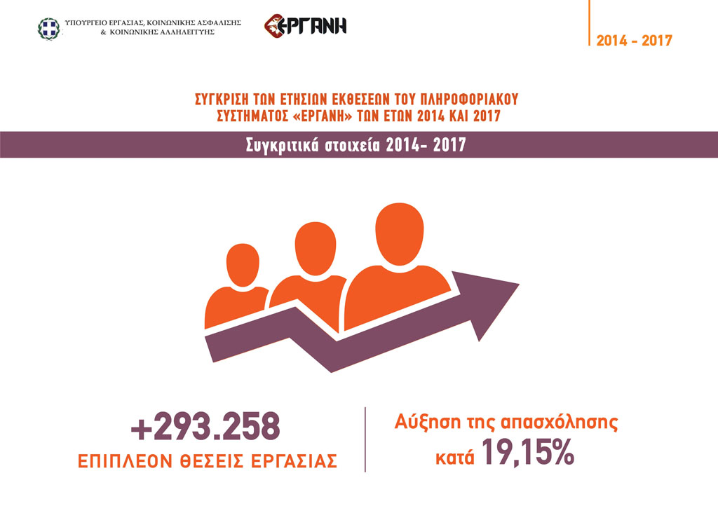 Αύξηση της απασχόλησης κατά 293.258 θέσεις εργασίας ή ποσοστό 19,15% προκύπτει συγκρίνοντας τα στοιχεία των ετών 2014 και 2017, σύμφωνα με τα στοιχεία του ειδικού τεύχους του Πληροφοριακού Συστήματος «ΕΡΓΑΝΗ».