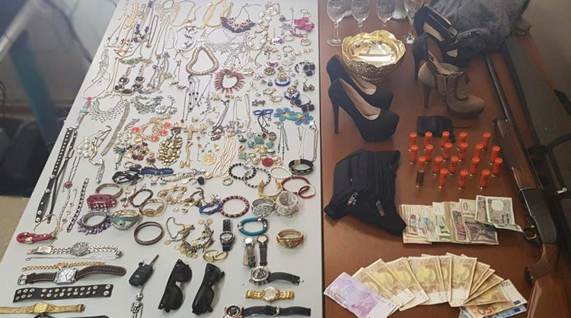 Σε έρευνες που έγιναν στις οικίες των κατηγορουμένων, καθώς και στην κατοχή τους, βρέθηκαν και κατασχέθηκαν πλήθος κοσμημάτων ρολογιών, γυαλιών ηλίου, ηλεκτρονικών συσκευών, κινητών τηλεφώνων, διαρρηκτικών εργαλείων, μία καραμπίνα, είκοσι φυσίγγια και το χρηματικό ποσό των 1.370 ευρώ.
