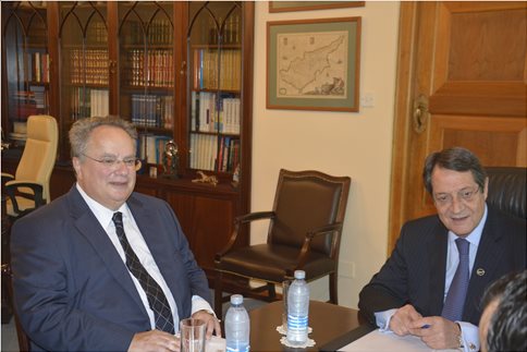Την πορεία του Κυπριακού και άλλα συναφή θέματα εξέτασαν, σε διευρυμένη σύσκεψη στο Προεδρικό Μέγαρο της Λευκωσίας, ο Κύπριος Πρόεδρος , Νίκος Αναστασιάδης, και ο υπουργός Εξωτερικών της Ελλάδας, Νίκος Κοτζιάς.