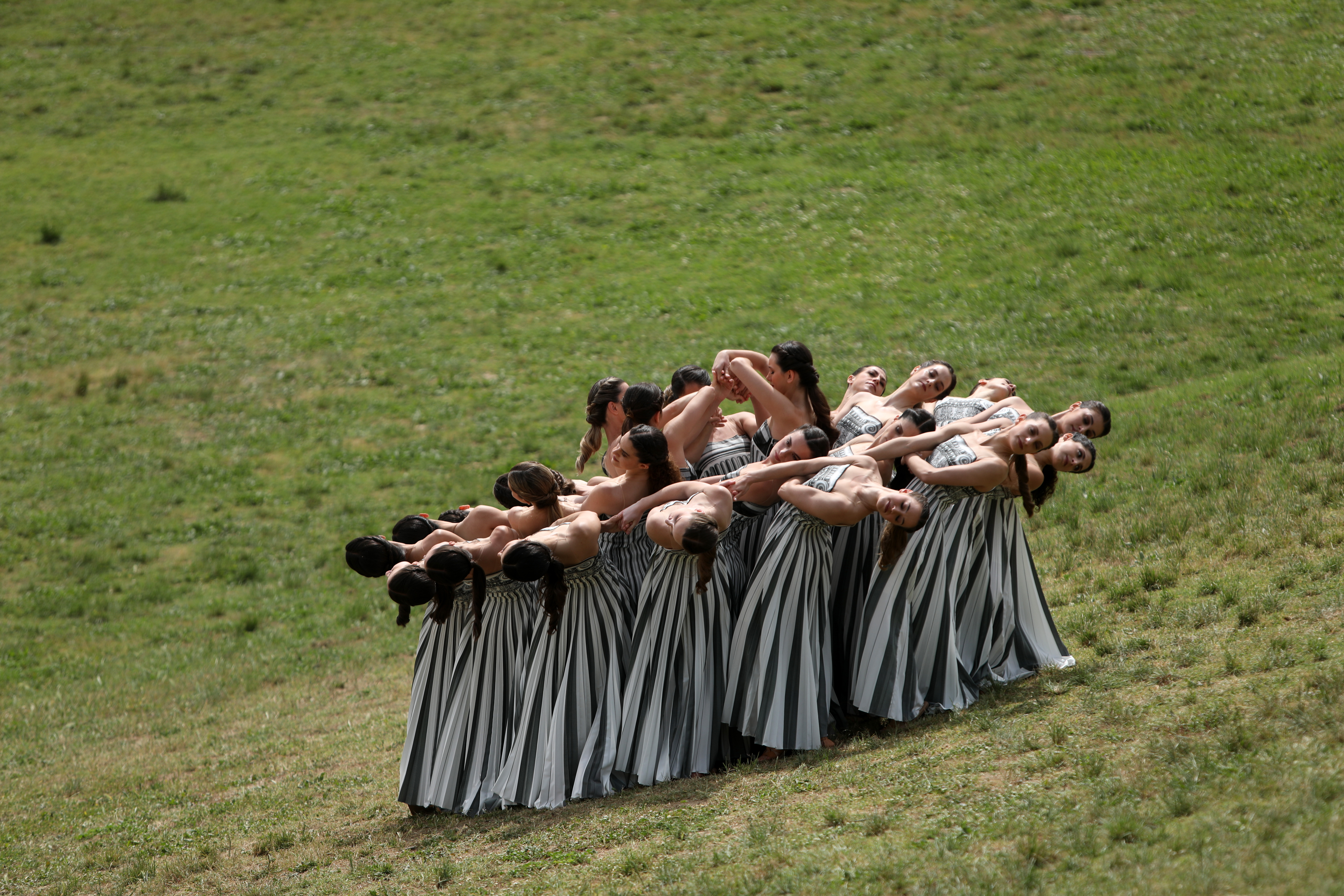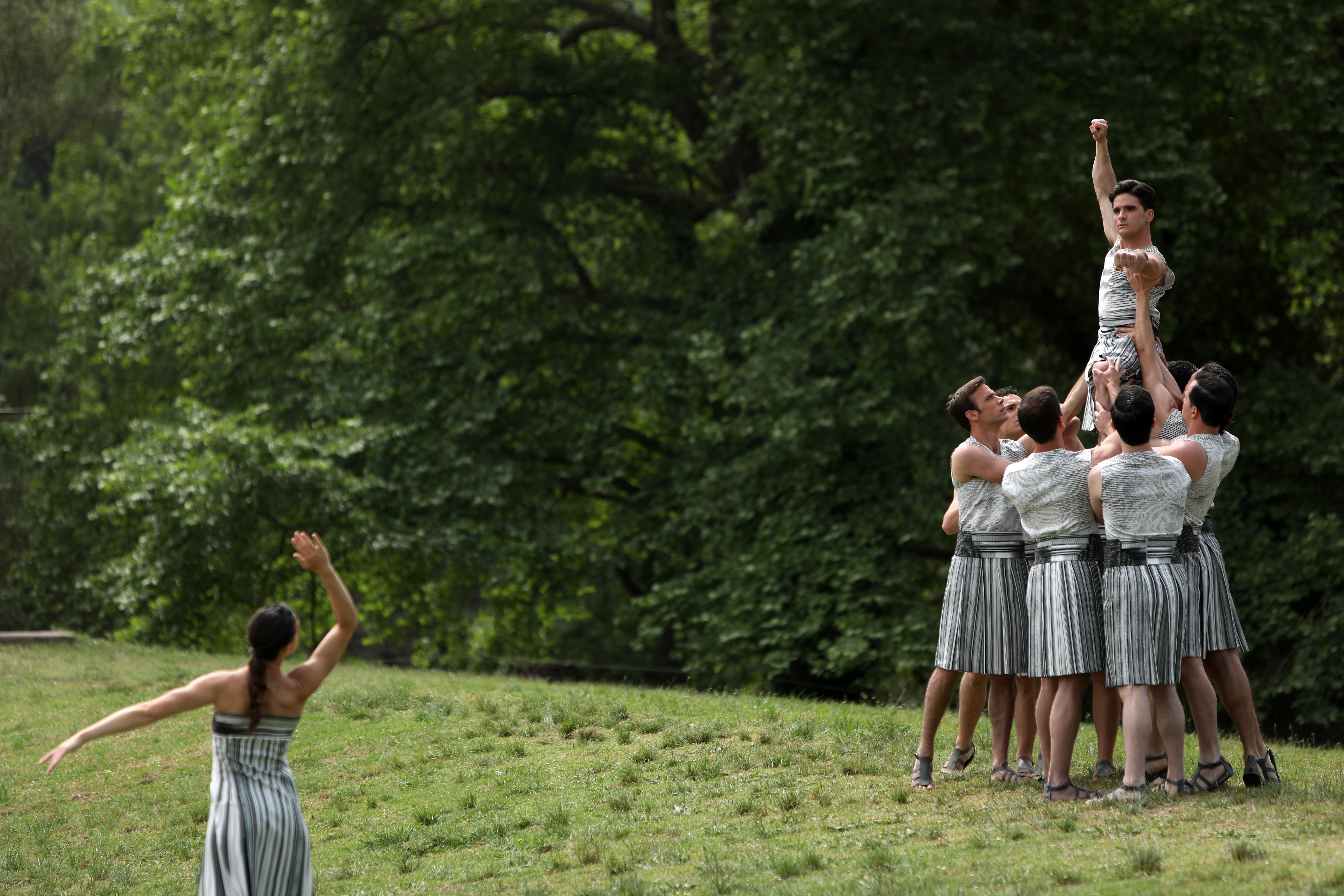 Στη συνέχεια ακολούθησε ο Χορός των Ιερειών και των 15 Κούρων στο χορευτικό που δημιούργησε και σκηνοθέτησε η Χορογράφος Αρτεμις Ιγνατίου, με ενδυμασίες της Μαίρης Κατράντζου, υπό τους ήχους της μουσικής του συνθέτη Δημήτρη Παπαδημητρίου, πριν η Πρωθιέρεια Μαίρη Μηνά εισέλθει με την Ολυμπιακή Φλόγα στο Αρχαίο Στάδιο για να την παραδώσει στoν πρώτο Λαμπαδηδρόμο, Χρυσό Ολυμπιονίκη της Κωπηλασίας, Στέφανο Ντούσκο μαζί με ένα κλαδί ελιάς.