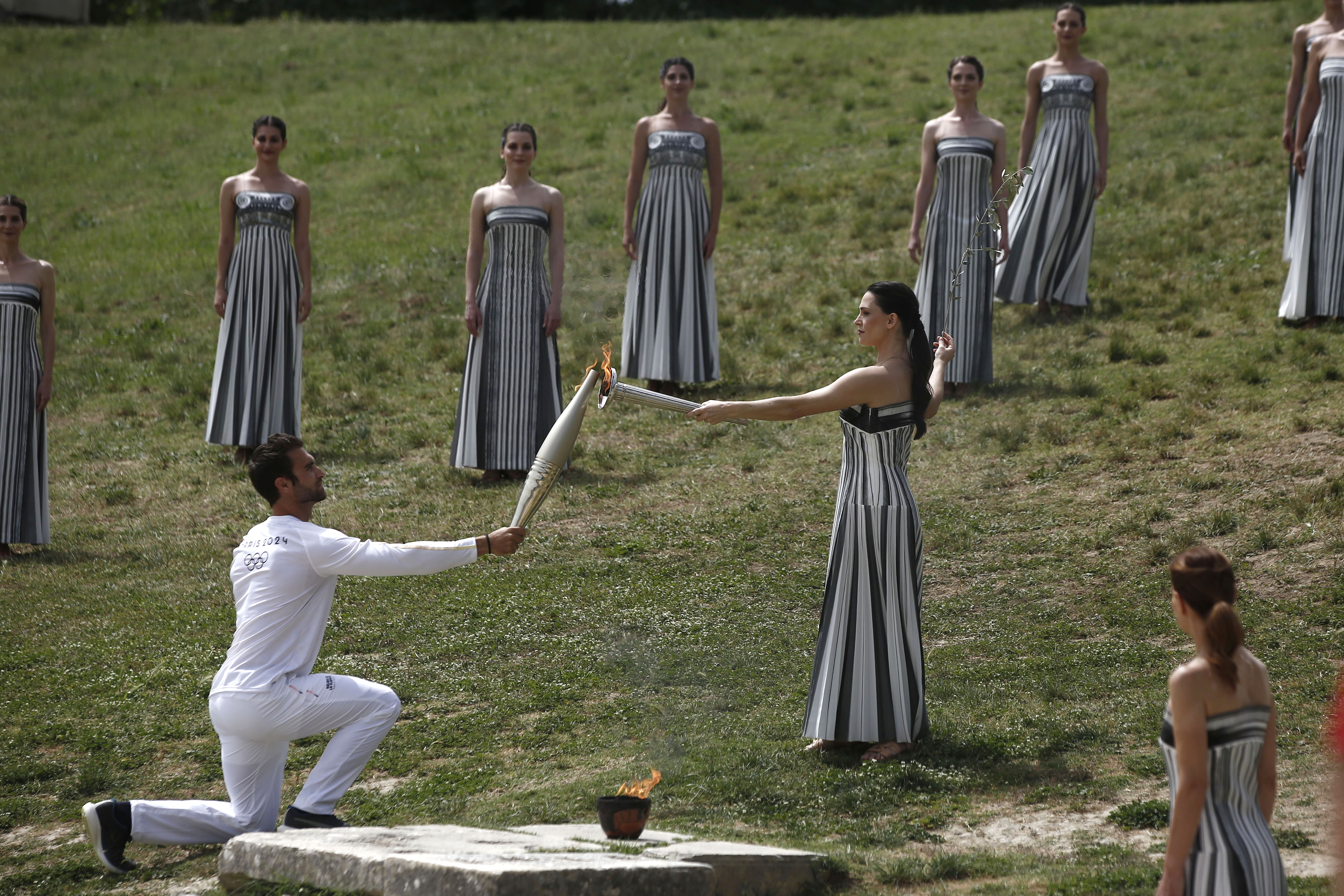 Η Ολυμπιακή Φλόγα δεν άναψε-, λίγο μετά τις 12:15- με τον παραδοκιακό τρόπο, από τις ακτίνες του ήλιου, αφού δεν το επέτρεψαν οι καιρικές συνθήκες (συννεφιά), αλλά για το άναμμα της δάδας χρησιμοποιηθήκε η βοήθεια της εφεδρικής Φλόγας που κρατήθηκε στο τέλος της χθεσινής πρόβας τζενεράλε, σε μία μυσταγωγική τελετή, υπό το βλέμμα της Προέδρου της Δημοκρατίας Κατερίνας Σακελλαροπούλου.
