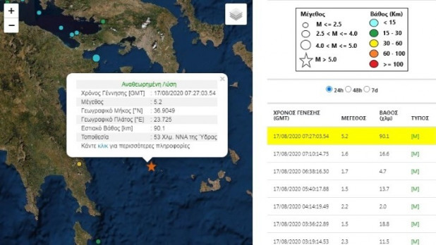 Σύμφωνα με τη δεύτερη μέτρηση που πραγματοποίησε και ανακοίνωσε το Γεωδυναμικό Ινστιτούτο του Εθνικού Αστεροσκοπείου Αθηνών, ο σεισμός, που έγινε αισθητός και σε περιοχές της Αττικής, ήταν 5,2 βαθμοί της κλίμακας ρίχτερ, είχε εστιακό βάθος 90,1 χλμ, και το επίκεντρό του εντοπίζεται στο θαλάσσιο χώρο 53 χλμ. ΝΝΑ της Ύδρας και 119 νότια της Αθήνας.