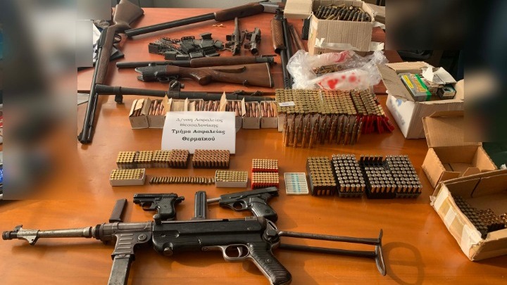 Κατόπιν έρευνας έρευνα που διενήργησαν αστυνομικοί της Ασφάλειας Θερμαϊκού, παρουσία δικαστικού λειτουργού, βρέθηκαν δύο πιστόλια με γεμιστήρες, 856 φυσίγγια και μία κάνη πολεμικού όπλου.