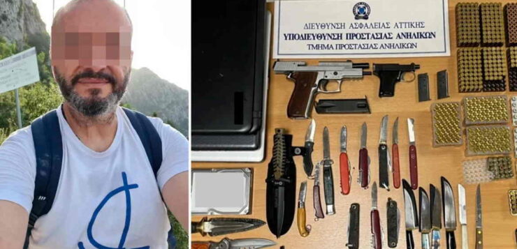 Κατά τη διάρκεια των ερευνών βρέθηκαν στην κατοχή του 53χρονου ένα μίνι οπλοστάσιο, καθώς κατασχέθηκαν 2 πιστόλια, 572 φυσίγγια, 21 μαχαίρια και μια ξιφολόγχη.