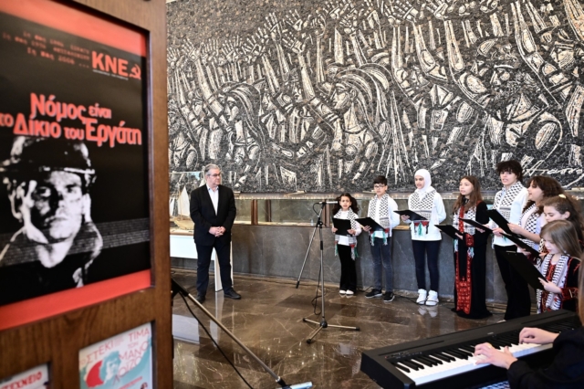 Η παιδική χορωδία της Παλαιστινιακής Παροικίας Ελλάδος έψαλλε τα Πρωτοχρονιάτικα κάλαντα στον ΓΓ της ΚΕ του ΚΚΕ Δημήτρη Κουτσούμπα, το πρωί του Σαββάτου (30/12), στην έδρα της ΚΕ στον Περισσό.