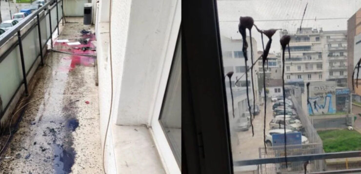 Κατά πληροφορίες άγνωστοι πέταξαν γυάλινα μπουκάλια γεμάτα με μαύρη και κόκκινη μπογιά.