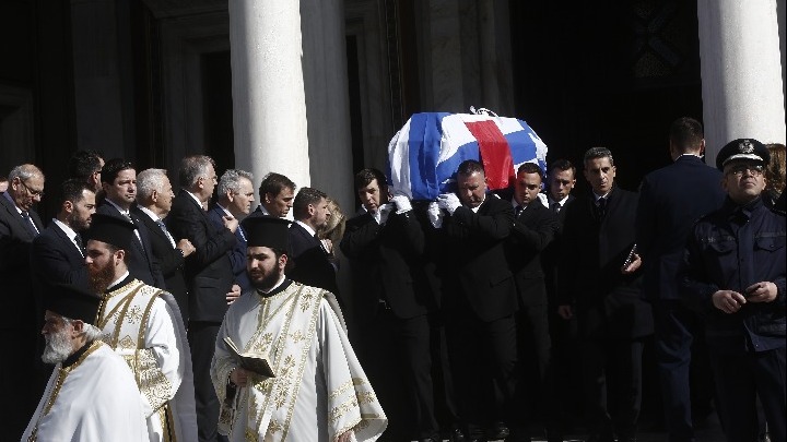 Την εξόδιο ακολουθία, που τελέσθηκε δημόσια δαπάνη, χοροστατούντος του αρχιεπισκόπου Αθηνών και Πάσης Ελλάδος Ιερωνύμου, παρακολούθησαν ο Πρόεδρος της Δημοκρατίας, Κωνσταντίνος Τασούλας, ο πρωθυπουργός Κυριάκος Μητσοτάκης -ο οποίοι εκφώνησαν επικήδειες ομιλίες- συνοδευόμενος από τη σύζυγό του Μαρέβα Γκραμπόφσκι, ο αντιπρόεδρος της Κυβέρνησης Κώστας Χατζηδάκης, η υπουργός Πολιτισμού Λίνα Μενδώνη, ο υπουργός Ανάπτυξης Άκης Θεοδωρικάκος και, μεταξύ άλλων, η υφυπουργός Μετανάστευσης, Σέβη Βολουδάκη, ο περιφερειάρχης Αττικής Νίκος Χαρδαλιάς, η πρώην Πρόεδρος της Δημοκρατίας Κατερίνα Σακελλαροπούλου, η Μαριάννα Λάτση, ο εφοπλιστής Θανάσης Μαρτίνος, ο αντιδήμαρχος Οικονομικού Προγραμματισμού του Δήμου Αθηναίων, Γιώργος Γιάνναρος, ο πρώην πρύτανης του ΕΚΠΑ, Θεόδωρος Φορτσάκης, ο νυν πρύτανης Γεράσιμος Σιάσος, ο περιφερειάρχης Στερεάς Ελλάδας, Φάνης Σπανός, ο κοινοβουλευτικός εκπρόσωπος του ΠΑΣΟΚ, Δημήτρης Μάντζος, ο πρώην υπουργός Άμυνας, Νίκος Αποστολάκης, η βουλευτής Θεοδώρα Τζάκρη, η πρώην υπουργός Άντζελα Γκερέκου κι από τον καλλιτεχνικό κόσμο ο Γιώργος Νταλάρας κι η Μιμή Ντενίση.