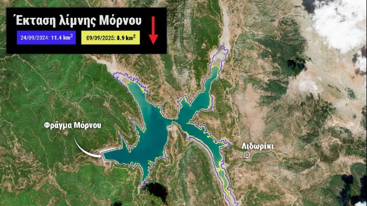 Η μικρότερη έκταση της λίμνης του Μόρνου από το 2014 και μετά παρατηρήθηκε μέσα στο πρώτο δεκαήμερο του Σεπτεμβρίου, και συγκεκριμένα στις 9 Σεπτεμβρίου 2025, σύμφωνα με το meteo.gr/ Εθνικό Αστεροσκοπείο Αθηνών, με βάση τα διαθέσιμα δεδομένα από τον δορυφόρο Sentinel-2. Παράλληλα, η μονάδα ΜΕΤΕΟ του Εθνικού Αστεροσκοπείου Αθηνών, ανακοινώνει την ενεργοποίηση μίας νέας υπηρεσίας ενημέρωσης των πολιτών, το Παρατηρητήριο της Τεχνητής Λίμνης Μόρνου (www.meteo.gr/mornos). «Το πρόβλημα της μείωσης της έκτασης αλλά και των αποθεμάτων της λίμνης του Μόρνου, οδήγησε τη μονάδα ΜΕΤΕΟ του Εθνικού Αστεροσκοπείου Αθηνών, να ενεργοποιήσει μια νέα υπηρεσία ενημέρωσης των πολιτών, το Παρατηρητήριο της Τεχνητής Λίμνης Μόρνου (www.meteo.gr/mornos)», αναφέρει χαρακτηριστικά η μονάδα METEO/ΕΑΑ.
