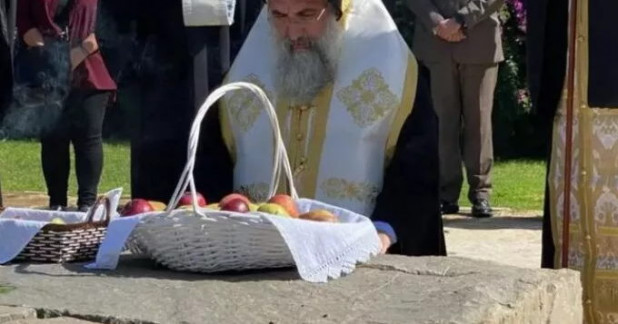 Ο Αρχιεπίσκοπος Κρήτης Ευγένιος γονατίζει στον τάφο του Καζαντζάκη