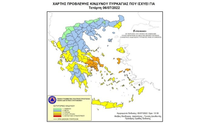 Πολύ υψηλός κίνδυνος πυρκαγιάς (κατηγορία κινδύνου 4) προβλέπεται αύριο Τετάρτη 6 Ιουλίου 2022, για τρεις περιφέρειες της χώρας σύμφωνα με το Χάρτη Πρόβλεψης Κινδύνου Πυρκαγιάς που εκδίδει η γενική γραμματεία Πολιτικής Προστασίας του υπουργείου Κλιματικής Κρίσης & Πολιτικής Προστασίας (www.civilprotection.gr).