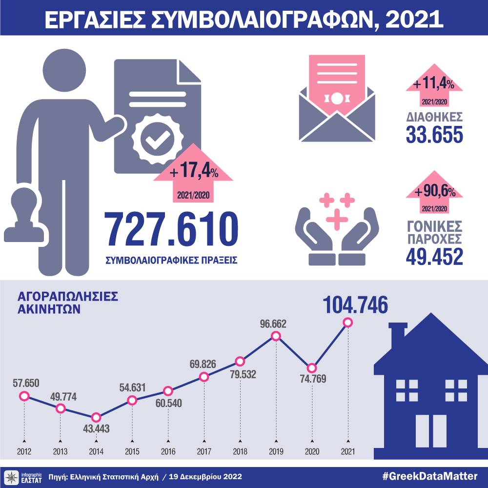 Σημαντική αύξηση κατέγραψαν το 2021 οι συμβολαιογραφικές πράξεις, με τις γονικές παροχές να σημειώνουν αύξηση 90,6% και τις δωρεές να σημειώνουν αύξηση 44,5% σε σχέση με το 2020. Σύμφωνα με την Ελληνική Στατιστική Αρχή (ΕΛΣΤΑΤ) το 2021 οι συμβολαιογραφικές πράξεις που πραγματοποιήθηκαν ανέρχονται σε 727.610 έναντι 619.944 το 2020 παρουσιάζοντας αύξηση κατά 17,4%.