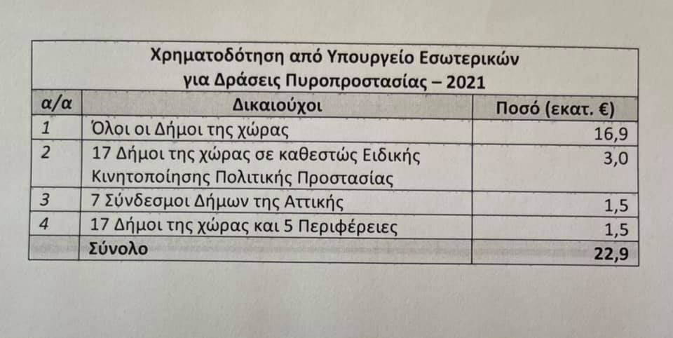 «Τελευταίο ψέμα που διακινούν είναι ότι για δράσεις πυροπροστασίας έχουν διατεθεί φέτος δήθεν 1,7 εκατ. ευρώ από την Ελληνική Κυβέρνηση. Η αλήθεια είναι ότι, μόνο από το υπουργείο Εσωτερικών, με υπογραφή μου, έχουν διατεθεί από τον Μάιο μέχρι σήμερα 22,9 εκατ. ευρώ (βλέπε Πίνακα). Και θα συνεχίσουμε να στηρίζουμε, κάνοντας ό,τι χρειαστεί», καταλήγει ο κ. Πέτσας.