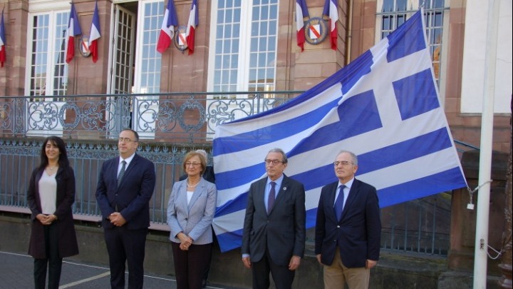 Σύμφωνα με ενημέρωση της μόνιμης αντιπροσωπείας της Ελλάδας στο Συμβούλιο της Ευρώπης, στη συνέχεια οι συμμετέχοντες μετέβησαν στο χώρο μπροστά στο Δημαρχείο στην κεντρική πλατεία του Στρασβούργου, Place Broglie, όπου έγινε η ανάκρουση του εθνικού ύμνου και η έπαρση της ελληνικής σημαίας, η οποία θα κυματίζει στο χώρο καθ’ όλη τη διάρκεια της εξαμηνιαίας ελληνικής προεδρίας, έως το Νοέμβριο.