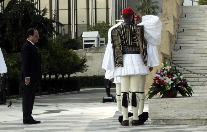Ο Γάλλος πρόεδρος έφτασε στο μνημείο του Αγνωστου Στρατιώτη κατευθείαν από το αεροδρόμιο συνοδευόμενος από τον πρωθυπουργό. Στο μνημείο τον υποδέχθηκε ο υπουργός Αμυνας Πάνος Καμμένος. Στον πρόεδρο της Γαλλικής Δημοκρατίας αποδόθηκαν τιμές αρχηγού κράτους από άγημα των τριών κλάδων των Ενόπλων Δυνάμεων. Στη συνέχεια κατέθεσε στέφανο και τήρησε ενός λεπτού σιγή. Η Φιλαρμονική του Πολεμικού Ναυτικού ανέκρουσε τους εθνικούς ύμνους των δύο χωρών και στη συνέχεια ο κ. Ολάντ επιθεώρησε το άγημα μαζί με τον πρωθυπουργό και αποχώρησε για το Προεδρικό Μέγαρο.