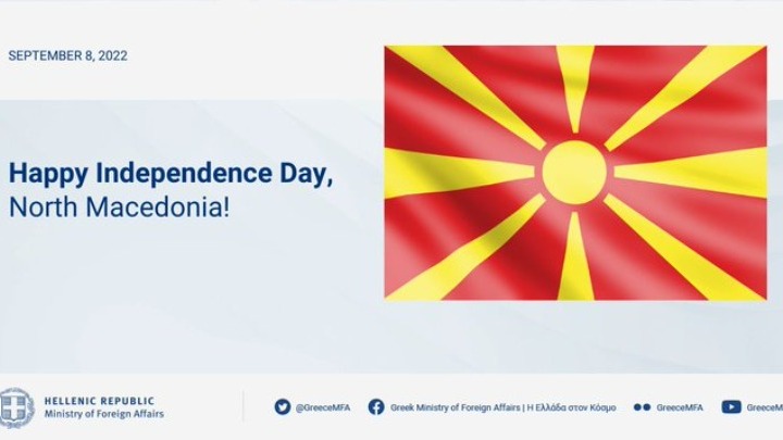 "Η Ελλάδα συγχαίρει και εκφράζει τις καλύτερες ευχές της στο λαό και την κυβέρνηση της Βόρειας Μακεδονίας, που γιορτάζουν σήμερα την Ημέρα Ανεξαρτησίας τους!", αναφέρει το υπουργείο Εξωτερικών με ανάρτησή του στο twitter.