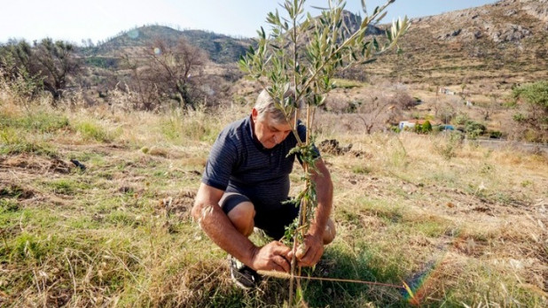 Σε ένα χωράφι στην Αγία Άννα της Βόρειας Εύβοιας, λίγο πάνω από τη θάλασσα, ο 71χρονος τότε Παναγιώτης Αναγνώστου, το επόμενο καλοκαίρι μετά την καταστροφική πυρκαγιά του Αυγούστου 2021, έχει σκύψει και φυτεύει τις ελιές του. Γύρω του το τοπίο παραμένει σημαδεμένο από τη φωτιά, με τους κορμούς των δέντρων να “ μαρτυρούν” τι προηγήθηκε πριν ένα χρόνο. «Μέχρι να δώσουν καρπό αυτές οι ελιές εγώ μπορεί να μην ζω, το κάνω όμως για τα εγγόνια μου, για το μέλλον, για να γευτούν αυτά τους καρπούς της», λέει ο κ. Αναγνώστου απευθυνόμενος στον ανιψιό του, τον φωτογράφο- δημοσιογράφο, Θοδωρή Νικολάου, που εκείνη την ώρα τον απαθανατίζει.