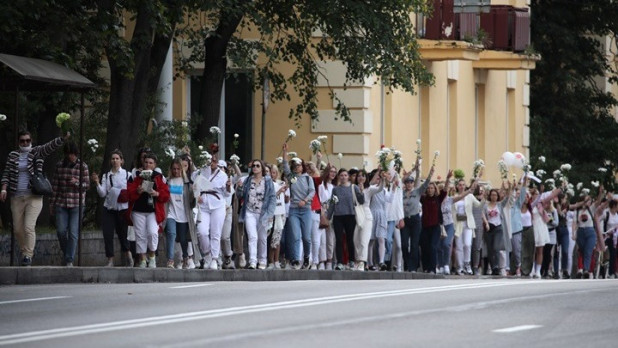 Στο ιστορικό κέντρο του Μινσκ, στην οδό Νεμίγκα, έχουν συγκεντρωθεί 100 άνθρωποι, με τις γυναίκες, πολλές από αυτές λευκοντυμένες, να κρατούν στα χέρια λουλούδια, καρδούλες ή πανό.
