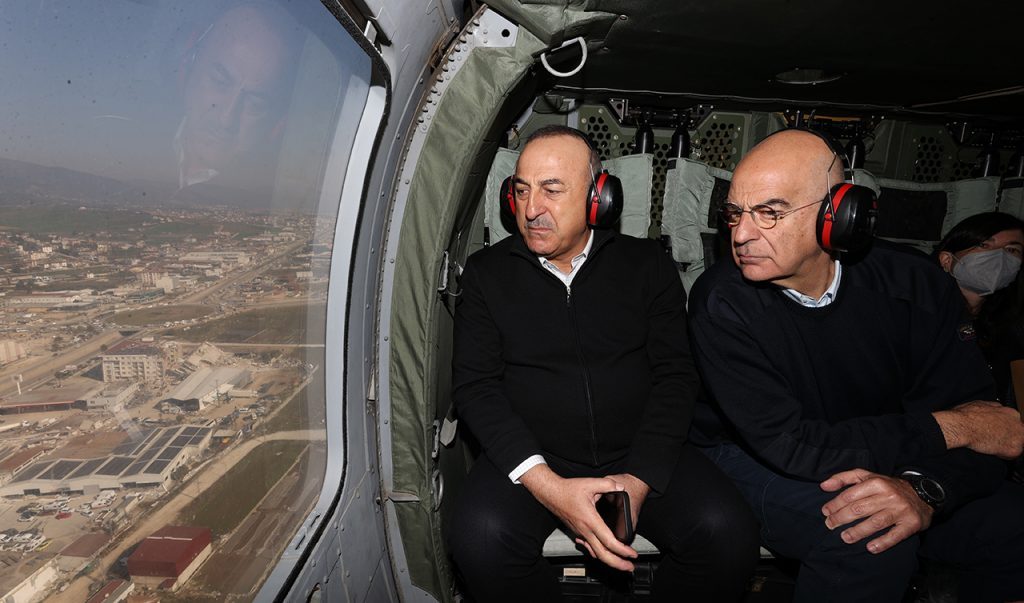 Χθες, ο έλληνας υπουργός Εξωτερικών Νίκος Δένδιας επισκέφθηκε την Αντιόχεια μαζί με τον ομόλογό του Μεβλούτ Τσαβούσογλου. Οι δύο υπουργοί είχαν μάλιστα έναν θερμό εναγκαλισμό μπροστά στις κάμερες στα Άδανα και στη συνέχεια πέταξαν με ελικόπτερο πάνω από τις πληγείσες περιοχές, προτού μεταβούν στο Κέντρο Πολιτικής Προστασίας στην Αντιόχεια, όπου λαμβάνονται οι αποφάσεις για τη διαχείριση της ανθρωπιστικής -και όχι μόνο- κρίσης που προέκυψε μετά τις φονικές δονήσεις.