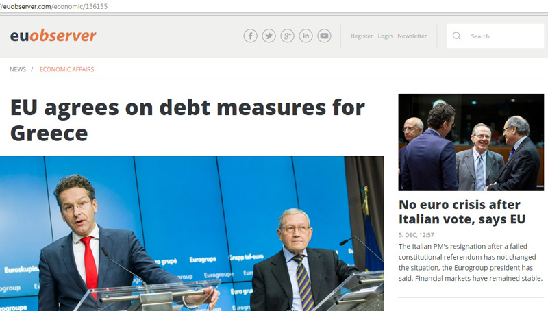 Ειδικότερα ο EUOBSERVER αναφέρεται στο σχέδιο των βραχυπρόθεσμων μέτρων που παρουσίασε ο Ευρωπαϊκός Μηχανισμός Στήριξης (ΕΜΣ), επισημαίνοντας ότι η εφαρμογή τους θα ξεκινήσει άμεσα, καθώς και στις σχετικές δηλώσεις του επικεφαλής του Μηχανισμού Kλάους Ρέγκλιγκ, ο οποίος υπογράμμισε ότι τα οφέλη από το συγκεκριμένο πακέτο μέτρων είναι ξεκάθαρα και το κόστος περιορισμένο, συμπληρώνοντας ταυτόχρονα ότι μέχρι το 2060 θα μπορούσε να επιτευχθεί 20% μείωση του χρέους σε σχέση με το ΑΕΠ.