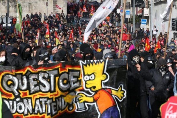 Ανάμεσα σε εκατοντάδες νέους που ξεκίνησαν από την πλατεία Νασιόν για να φθάσουν στον ανατολικό σιδηροδρομικό σταθμό (Gare de l'Est) απ' όπου πρόκειται να ξεκινήσει η πορεία των σιδηροδρομικών, ομάδες ατόμων, πολλά από τα οποία φορούσαν κουκούλες, επιτέθηκαν σε δύο τραπεζικά καταστήματα και σε διαφημιστικές πινακίδες και πέταξαν αντικείμενα εναντίον των ειδικών μονάδων της αστυνομίας για την αντιμετώπιση ταραχών. Λίγο πριν από το μεσημέρι, οι αστυνομικοί έκαναν χρήση δακρυγόνων εναντίον αυτών των διαδηλωτών.