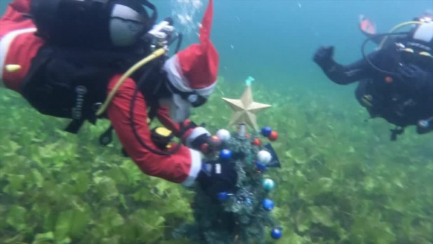 Την περασμένη Κυριακή, τρεις δύτες από το Σύλλογο Υποβρύχιων Αθλημάτων, φορώντας στολή Άγιου Βασίλη, με κόκκινο σκούφο και λευκή γενειάδα, μετέφεραν το στολισμένο έλατο στον βυθό, συνεχίζοντας μια ξεχωριστή παράδοση του συλλόγου που μετρά ήδη δέκα χρόνια.