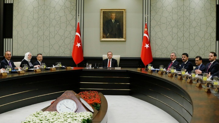 Ο Ερντογάν συγκάλεσε το νέο υπουργικό συμβούλιο στο προεδρικό μέγαρο αργά τα απόγευμα, έπειτα από μια τελετή στην Άγκυρα κατά τη διάρκεια της οποίας υποσχέθηκε να «εργαστεί ακούραστα για την οικοδόμηση μιας Τουρκίας που θα μπορεί να προβάλει προς το μέλλον με αυτοπεποίθηση».