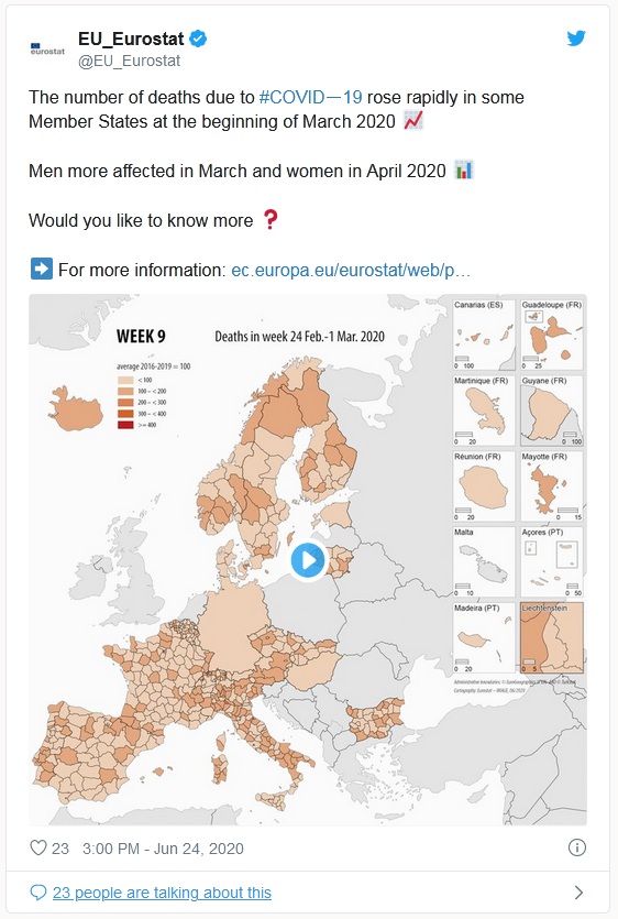 Σύμφωνα με τα στοιχεία, που αφορούν σε 21 χώρες (Βέλγιο, Βουλγαρία, Τσεχία, Δανία, Γερμανία, Εσθονία, Ισπανία, Γαλλία, Ιταλία, Λιθουανία, Λουξεμβούργο, Ουγγαρία, Αυστρία, Πορτογαλία, Σλοβακία, Φινλανδία, Σουηδία, Ισλανδία, Λιχτενστάιν, Νορβηγία και Ελβετία), καταγράφηκαν 140.000 περισσότεροι θάνατοι στα τέλη Μαρτίου και στις αρχές Απριλίου, δηλαδή μεταξύ της 10ης και 17ης εβδομάδας του χρόνου, σε σχέση με την αντίστοιχη περίοδο των ετών 2016-2019.